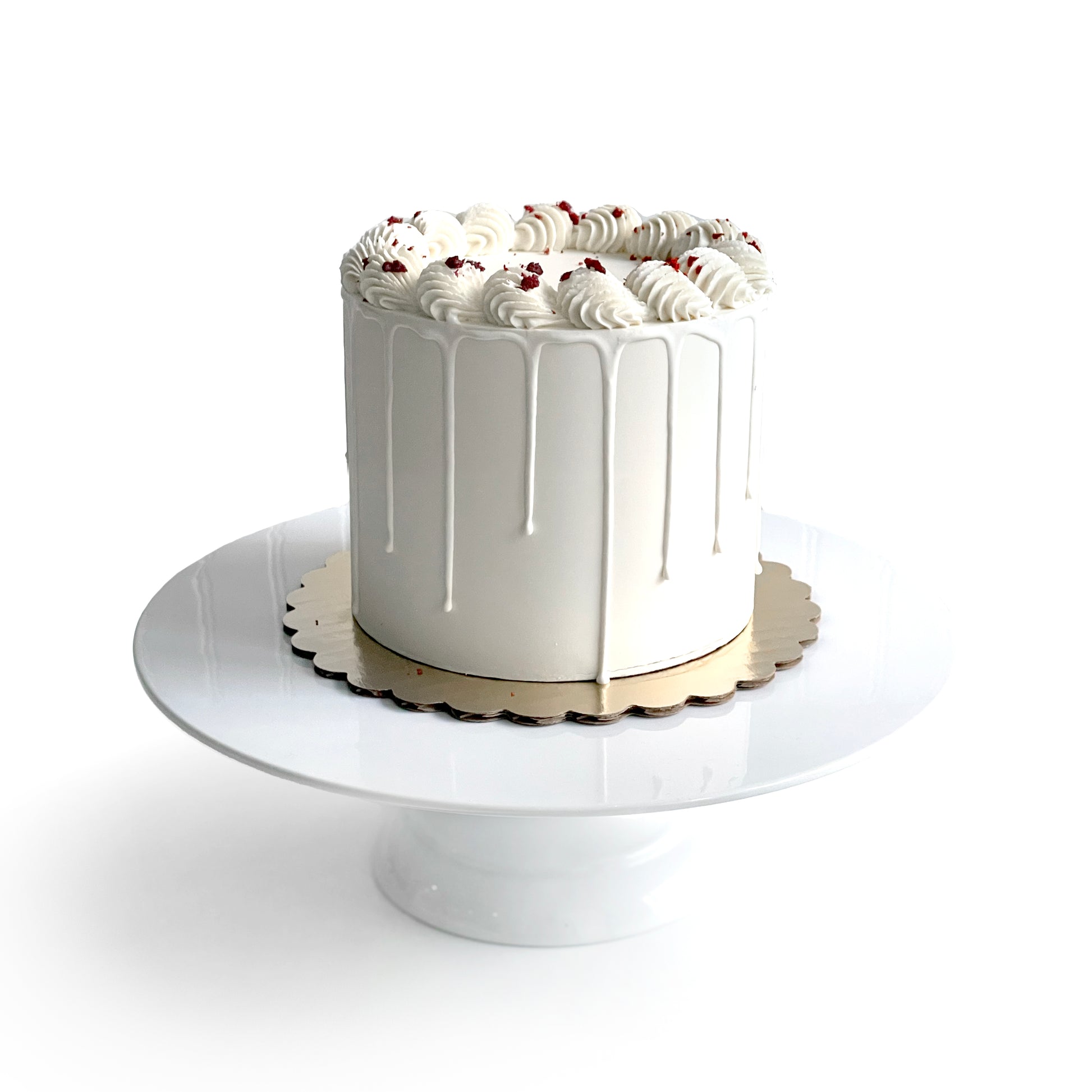 Red Velvet Cake filled w/Cream Cheese Buttercream covered in White Chocolate Ganache